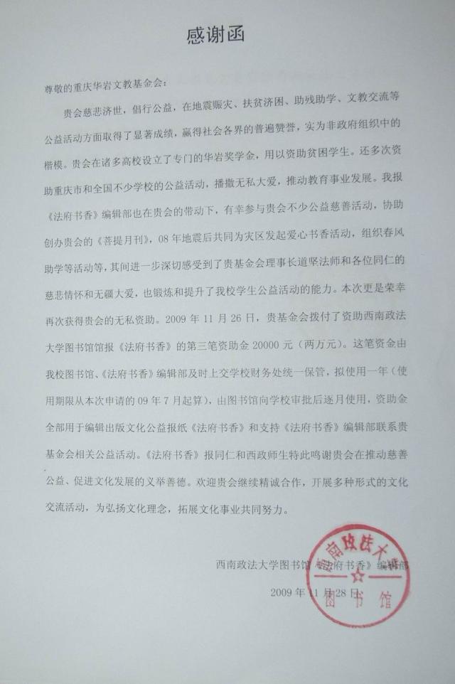 贵会慈悲济世,倡行公益,在地震赈灾、扶贫济困、助残助学、文教交流等公益活动方面取得了显著成绩,赢得社会各界的普遍赞誉,实为非政府组织中的楷模。贵会在诸多高校设立了专门的华岩奖学金,用以资助贫困学生。还多次资助重庆市和全国不少学校的公益活动,播撒无私大爱,推动教育带业发展。我报《法府书香》编辑部也在贵会的带动下,有幸参与贵会不少公益慈善活动,协助创办贵会的《菩提月刊》,08年地震后共同为灾区发起爱心书香活动,组织春风助学活动等,其间进一步深切感受到了贵基金会理事长道坚法师和各位同仁的慈悲情怀和无疆大爱,也锻炼和提升了我校学生公益活动的能力。本次更是荣幸再次获得贵会的无私资助。2009年11月26日,贵基金会拨付了资助西南政法大学图书馆馆报《法府书香》的第三笔资助金20000元(两万元)。这笔资金由我校图书馆、《法府书香》编辑部及时上交学校财务处统一保管,拟使用一年(使用期限从本次申请的09年7月起算),由图书馆向学校审批后逐月使用,资助金全部用于编辑出版文化公益报纸《法府书香》和支持《法府书香》编辑部联系贵基金会相关公益活动。《法府书香》报同仁和西政师生特此鸣谢贵会在推动慈善公益、促进文化发展的义举善德。欢迎贵会继续精诚合作,开展多种形式的文化交流活动,为弘扬文化理念,拓展文化事业共同努力。