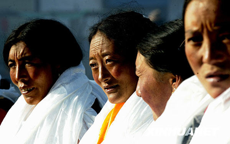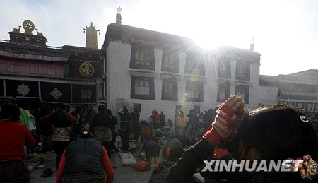 藏族信众在拉萨大昭寺前祈福