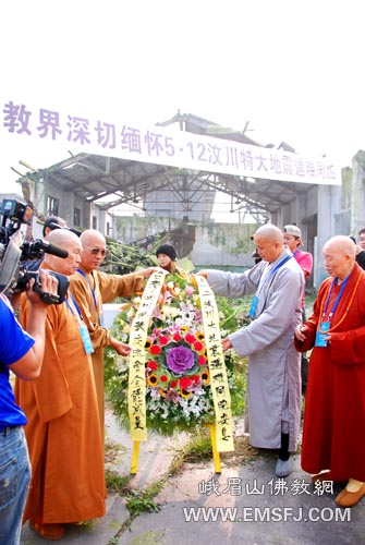 法会结束后,与会人员乘车前往什邡市穿心店地震遗址以及马祖村参观考察,并在地震遗址前敬献了鲜花,深切缅怀“5·12”汶川大地震遇难同胞。