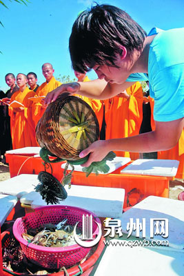 2009年11月6日,在福建泉州市区江滨北路浔埔码头,泉州少林寺方丈常定法师带领众多信众抬着装满各种活鱼的水箱,集体乘船前往泉州湾小坠门处,将3000多尾鱼放生,这些鱼价值两万多元,包括鳗鱼、石斑鱼等12个种类。