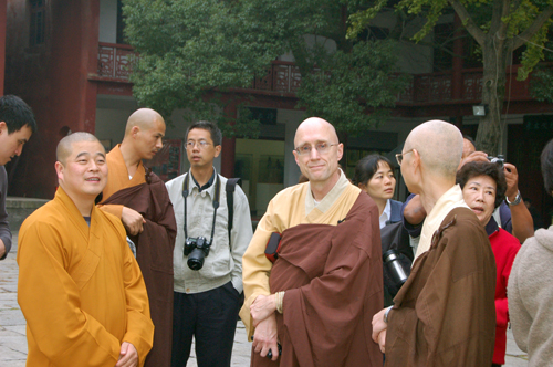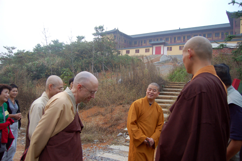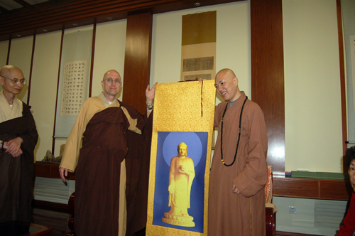“西方传统的天主教、基督教与净土法门在入门上都是很强调信愿的,在西方国家弘扬净土法门其实更为直接。要想让西方的信众接受净土法门,一定要强调阿弥陀佛十劫以前早已成就的大悲愿力的无尽功德,强调净土法门是心作佛是心是佛的圆顿教法。当我们以至诚心念这句名号的时候,阿弥陀佛佛果地上的全体功德就在转化为我们自己的功德,我们的心量越大,收益就会越大,就象无尽的大海,你的容器越大就能装的越多。所以祖师讲,是心作佛是心是佛要比明心见性、见性成佛来得更直接。身在含元殿,何须问长安;如人但念阿弥陀,是名无上深妙禅。"大安法师还就东林大佛的建设进展向客人们作了介绍。