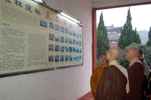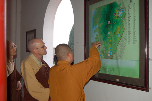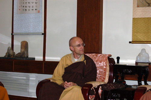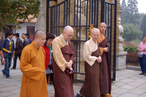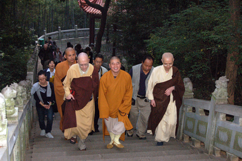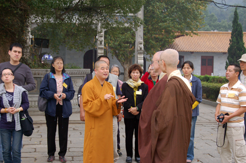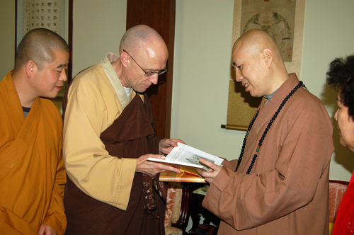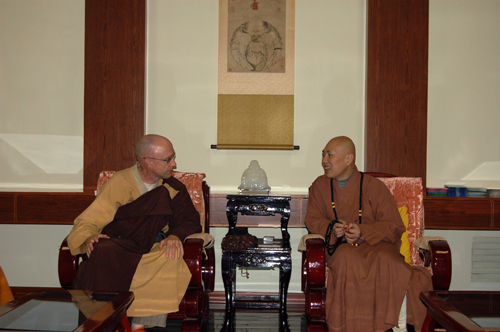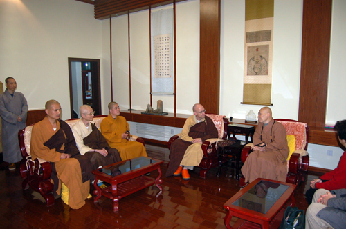 在方丈室里,大安法师热情接待了这些远道而来的贵客。“上人生前不但教我们坐禅,也带我们打佛七。上人在打佛七的时候就常讲,净土宗的发源地是在庐山东林寺”。恒实法师向大安法师简单介绍了近几年万佛城的发展情况,感叹现在西方年轻人宗教情怀的普遍缺失。“前段时间有几个欧洲的青年人到万佛城打观音七,他们原本是没什么宗教信仰的,念了几天圣号,感觉非常受用,身心都很愉悦。在欧美国家,净土法门还是没有普及开来。”