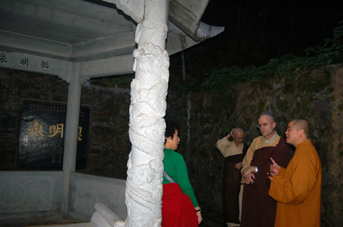 道元法师与恒实法师在年初举办的第二届世界佛教论坛上相识,有朋自远方来分外欢喜。道元法师带领客人们参观了虎溪桥、莲池,远公塔、罗汉松、译经台、闭关房、聪明泉等处。东林寺悠久的历史、深厚的文化底蕴都令客人们赞叹不已。在闭关房前,客人们饶有兴致的询问了闭关的相关问题,并表示有机会一定来东林寺参加闭关修行。道元法师还向客人们简单介绍了东林寺寺院建设、基层弘法、慈善事业的发展情况。在介绍到东林寺不收门票、东林大佛建成后也不收门票、完全拒绝商业化的做法时,客人们纷纷随喜赞叹。