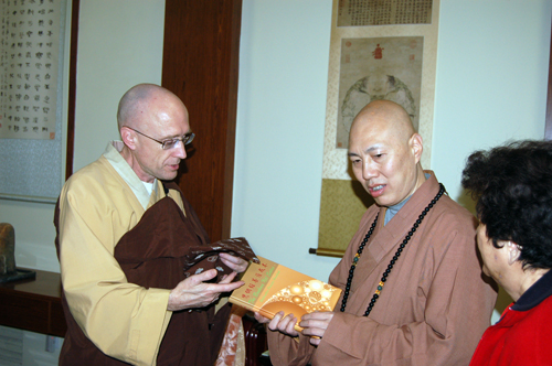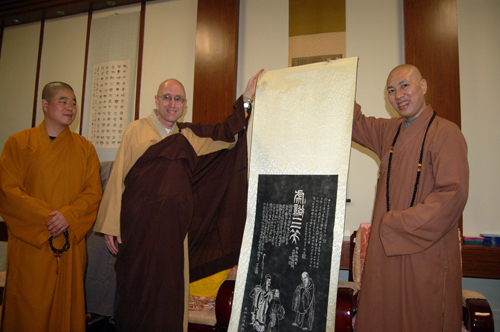 临别时宾主双方互赠礼品,恒实法师赠送给大安法师中英双语的《梵网经菩萨戒本》和《宣化上人开示集》,大安法师回赠客人《净土宗教程》、《净宗法语大观》、《虎溪三笑图》、东林大佛中稿佛像。恒实法师向大安法师表达了希望万佛城与东林寺加强交流的愿望,大安法师表示赞同并邀请恒实法师一行在适当的机缘再来东林作客。