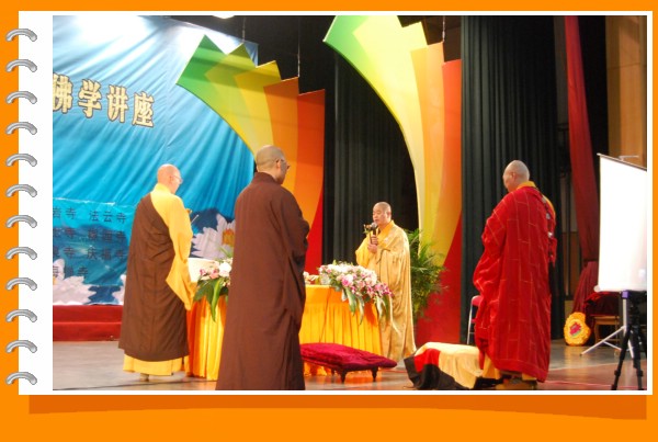 三天以来,与会大众无时无刻都能感受到佛学讲座的形式美,这种唯美的形式无微不至的体现了大会主办方的慈心、悲心、耐心、细心。上午七点半就开始入场,门口的义工鞠躬欢迎,会场内的义工引领信众安安静静的走入会场,身着紫色唐装的礼仪居士手举“肃静”、“请关闭手机”的牌子缓缓绕场而行。主持人米米领着大家一边唱诵《三宝歌》《燃灯之歌》等佛教歌曲一边等待法会开始。8点50左右,来自庐山东林寺的上道下元法师身着袈裟,手执法器,唱响南无本师释迦牟尼佛的名号,秦皇岛市佛教协会会长上存下海法师引领手捧鲜花的礼仪团迎请法师,与会信众一起唱响本师释迦牟尼佛的佛号,一千多人的声音会在一处,心也会在一处。那佛号声在会场上空回荡,遍满虚空,那不可思议的摄受之力让听闻之人无不升起心离娑婆,直向西方之念。伴随着震撼人心的钟鼓音乐,上大下安法师庄严的步入讲坛,焚香礼拜,上道下元法师唱响开经偈,“无上甚深微妙法,百千万劫难遭遇。我今见闻得受持,愿解如来真实义”,然后法师开始讲法。信众目不暂舍,侧耳聆听,共沾法雨,同沐甘霖。