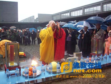 2009年12月13日,今天是南京大屠杀30万遇难同胞72周年祭日,上午8点30分到9点30分,中日两国僧人在纪念馆祭场举行世界和平法会,悼念30万遇难亡灵。来自日本东本愿寺、灵云寺、圆光寺、圆照寺、东净法寺等寺院的近30位日本僧人,和来自南京毗卢寺的50多位僧人和信众,以及30位南京大屠杀幸存者参加了法会。