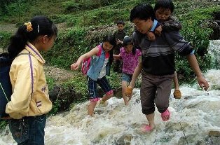 下雨天要背送孩子过河。两夫妇,一所小学,没有文具、没有体育设施、没有红旗,一办就是9年。
