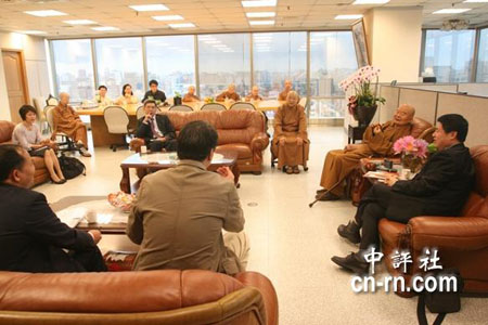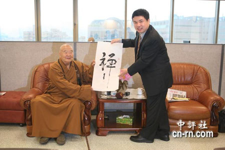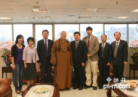 已83岁高龄的星云大师近年视力下降,看不太清东西,昨天在佛光山台北道场接见中评社高层访问团,星云大师精神非常好,与访问团谈了一个多小时。访问结束后,星云大师还特别吩咐以素菜招待访问团一行。