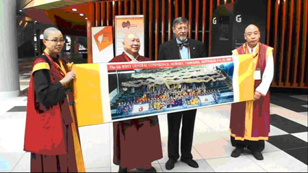 世界佛教青年僧伽会会长、东亚宗教学会中国分会副会长 薄伽梵 智及维摩诘法师向2009年世界宗教议会董事团主席 Gary D Bouma赠送第五届世界佛教青年僧伽大会丝绸画卷并祝贺。