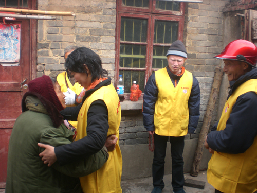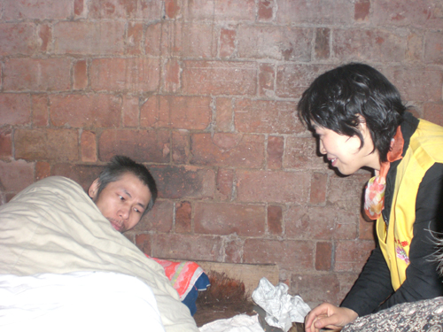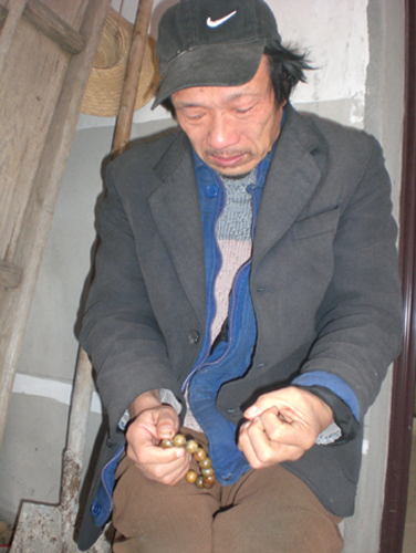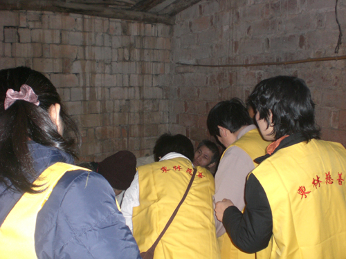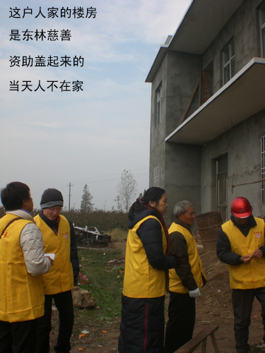 还有一个印象最深的关怀对象是陈维忠,60年生人。他的房顶因为资金问题,一直没有封顶,露着天。一下雨,水能淌一屋子。在他八面透风、无一丝暖意的家里,他絮絮叨叨的对谭敏师兄诉说着自己的不幸遭遇,用意准确的咬文嚼字和他潦倒颓废的神态不甚相符。送给他一串佛珠,他在手里不停的摩挲,能看出他的珍惜。