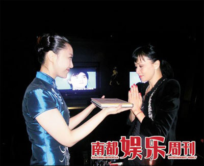 活动结束,刘嘉玲再次发挥本性,立刻召集三五好友直奔她的Muse酒吧K歌,四楼的大包厢里,刘嘉玲已经换上黑色西装正襟危坐,听一位男性好友唱歌。当身边的明星友人傅冲拿出精心准备的传统文化书籍及佛门信件赠与她时,刘嘉玲顿时面露喜色,认真地双手合十,虔心接受。
