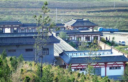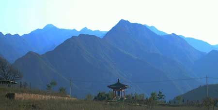 汽车穿周至县城南行,至马召,沿环山公路而上,至东岭,可以鸟瞰仙游寺的全景。仙游寺位于黑河南岸,坐南向北,后有狮山坐镇,前有象岭、东岭把守,清澈见底的黑河水从寺前流过,群山环抱,一水中流,气象清幽,真是一块仙境宝地。