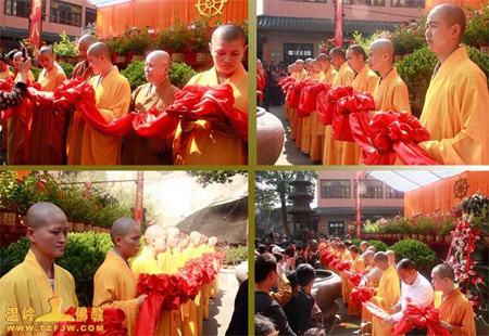 庆典仪式由若宽法师主持,黄霞东局长、金立东秘书长、刘云彪秘书长、颜忠明先生分别作讲话,常君法师致答谢词。并请各位领导与护法居士为奠基仪式剪彩,随后,来自各大寺院的21位法师为藏经楼奠基主法。