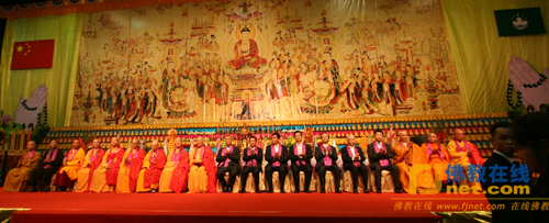 出席开幕式的领导有,澳门特别行政区行政长官何厚铧先生,国家宗教事务局蒋坚永副局长,中央人民政府驻澳门特别行政区联络办公室崔国潮秘书长,香港文汇报社长、大会共同主席王树成先生,全国人大代表、大会共同主席刘艺良先生,大会共同主席何庆先生、何敬麟先生;来自两岸四地的佛教界诸山长老有全国人大代表、中国佛教协会副会长圣辉长老,台湾中国佛教会理事长净良长老,澳门佛教总会会长泉慧长老,香港佛教僧伽联合会会长绍根长老,全国政协委员、内蒙古佛教协会会长贾拉森仁波切,青海陀乐寺住持阿旺嘉措仁波切,澳门佛教中心协会会长、澳门无量寿功德林住持、大会共同主席戒晟法师;来自海外的佛教界诸山长老有世界佛教僧伽会秘书长、印尼大丛山西禅寺住持慧雄法师,新加坡佛教总会秘书长广品法师,韩国佛教宗正协会会长迦山长老,泰国摩诃殊拉龙宫大学班亚大法师,澳大利亚南海普陀寺墨尔本兜率内院住持妙净法师。海内外三大语系四众弟子以及社会各界人士济济一堂,共襄盛举。正兴法师、演慈法师担任主持人。