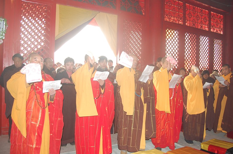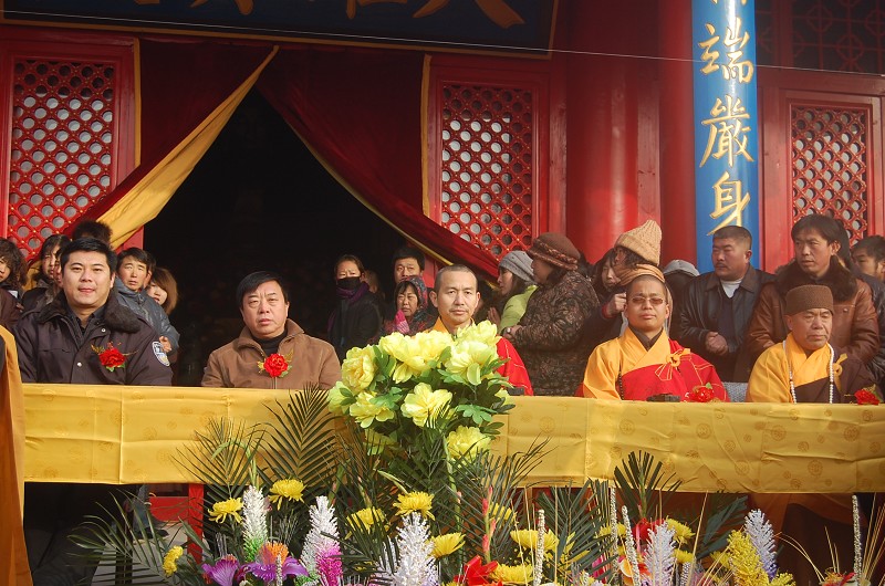 各位来宾!德泉寺在1998年之前仍是杂草丛生,可见残垣断壁,一片废墟。自五台山古佛寺证圆长老回俗籍家乡筹建德泉寺,发起四众佛子恢复明代古刹;隆发长老后继大业,苦行建寺,艰辛卓绝。今日的德泉寺殿宇宏伟,楼阁壮观,佛像庄严,四众心安。这里的一砖一瓦,无不凝聚着证圆长老、隆发长老的汗水和心血。在这样一个贫瘠的农村能够建成如此规模的寺院,我们赞叹不已。