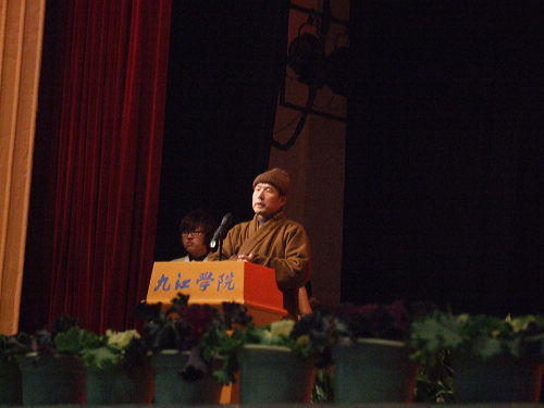 决赛在九江学院大礼堂展开,还没到比赛时间,同学们就纷纷涌进会场,现场的气氛十分热烈,大礼堂一层、二层都坐满了前来观看演讲比赛的同学,东林慈善功德会会长上镜下义法师也率领功德会部分工作人员和志愿者来到了比赛现场,九江学院副校长李炎生教授,副校长王万山教授,校长助理杨焱林教授也来到了现场观看比赛。东林《净土》杂志副主编朱景东老师、九江学院李宁宁教授等五人应邀成为本次决赛的评委。