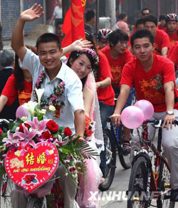 安徽芜湖市一对新人举行别开生面的自行车婚礼,新郎骑着自行车迎娶新娘,200多名自行车爱好者组成的迎亲队伍随行,场面壮观。 新华社发(水从泽 摄)