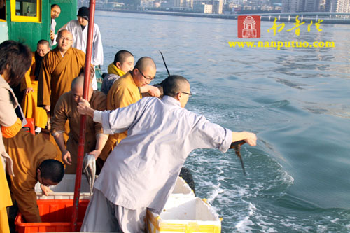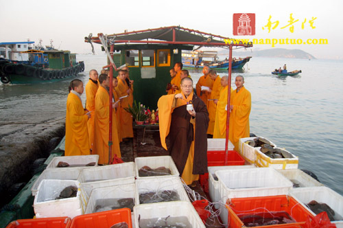 2010年1月13日清晨,闽南佛学院男众部部分学僧在福建省厦门市第一码头举行放生法会,闽南佛学院常务副院长界象法师主法并为水族慈悲加持。数以万计的鳗鱼、沙鱼、章鱼、螺、蟹等水族在与会大众慈悲诵念中离苦得乐。
