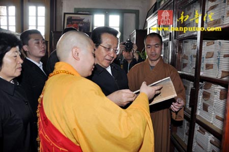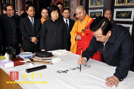 则悟法师陪同曾庆红一行参观了大雄宝殿等各主要堂口,并一一加以解释说明。在观看藏经阁佛像法宝时,则悟法师代表南普陀寺常住赠送一尊观音菩萨塑像和一幅自己手书的“中华盛世、社会和谐”的字画与曾庆红,曾庆红也为南普陀寺留下墨宝。