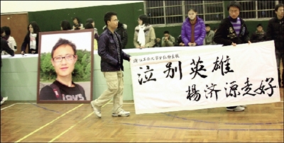 “泣别英雄,杨济源走好。”1日傍晚时分,学校在体育馆为杨济源设置了灵堂。闻讯后,悼念的人群朝这里涌来,直至22时,灵堂门口仍排着队,人流慢慢地移动,在沉重悲怆的哀乐中,许多与杨济源素不相识的同学手持白菊,走到杨济源的遗像前三鞠躬。