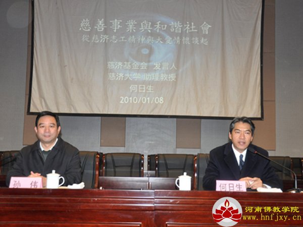 2010年1月10日至11日,慈济功德会发言人、佛教慈济慈善事业基金会人文志业部主任何日生应邀到河南佛教学院参观访问,河南佛教学院筹建委员会常务副主任王国全向何日生先生介绍了学院的筹建情况、总体规划和下步构想,双方并进行了亲切友好的交流。