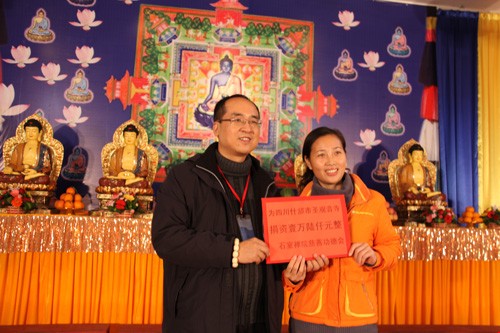 本次会员代表大会还先后进行了功德会2009年年度工作汇报(财务总结)、2010年年度工作计划报告,2009年年度优秀会员(单位)、新增委员的表彰仪式,并现场举行了“新春扶贫济困献爱心活动”,为百余位贫苦家庭发放了慰问金、食用油及棉被,并再次为四川地震灾区的什邡市圣观音寺及金龙村重建家园项目举行了捐资仪式,将凝聚着本会会员及社会各界善士真挚爱心的善款交到了受助代表手中。最后在石室禅院弘愿佛乐团的精彩文艺汇演中,与会大众们一起度过了这个难忘而又意义非常的新春元旦。(图文:石室禅院提供)