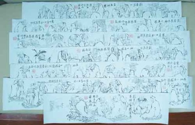 “过了几天,他又来了,说大哥再画俩,就一百罗汉!我就又画了俩一百罗汉。没多久,他说,这不是4个一百罗汉了嘛,大哥你按照这个串一串,再画个五百罗汉,就是前后层次挪动挪动。我一想也行,我不用再起稿了,动态稍微有一些变化,还是那些罗汉,就前后颠倒了一下,所以说画得也很顺手。完了以后,他就说再给我画个十八罗汉吧。在这种情况下,很顺利地把5个长卷就画完了。画这5个长卷我用了不到2个月,也就是说在7月前后就都画完了。为什么画这么快呢?他要得急嘛!再有,我也是越画越熟!”刘章崐先生说。