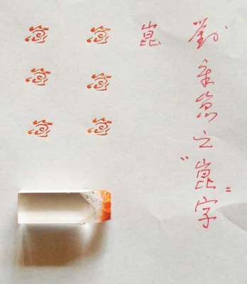 慢慢地刘章崐先生冷静了下来,他想,那本书后面不是写着“还将陆续出版”吗!于是他就刻了一个章,就在后面画的那些罗汉像上面打了一个暗款儿,就是刘章崐的“崐”字,是草书(刘章崐先生在纸上写下了这个字,还出示了那枚印章)。因为是朱砂画,所以他在图案上画类似的线条把暗款儿围起来,让他们发现不了。但先前画好的他已没办法打暗款儿。
