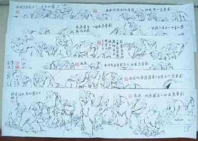 这次刘章崐参考百老图、百寿图等资料,把人物有聚有散地组合了一下,有长胡子的、有戴帽子的,他就都画成短胡须的了。刘章崐当时一鼓作气就画完了。