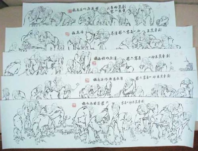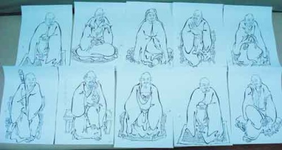 因为吴彬的佛像线条特别多,而且还有图案。刘章崐就画轮廓,而且袖口、衣边不做交待,只抓住动态。刘章崐说,他是画现代画的,讲究传神、生动。画菩萨就要静下来,心里不悲不喜,要踏实下来琢磨那个表情。画罗汉就不是了,什么样的面孔都有,不用那么费心思考虑。刘章崐还是以《马骀画宝》为基础,还搜集了很多戴敦邦的《水浒》叶子。画这些罗汉像,刘章崐不用起稿,20多分钟就画完一张。当时,刘姓画商让给他开车的司机就在刘章崐的画室等着,画完了以后马上拿走。所以这批画中有些画得比较潦草。刘章崐后来买了一个二手的复印机,把他认为画得理想的就印下来了。“就这样给他画了一套,就是后来西泠出的折叠的一百罗汉(《弘一大师罗汉长卷》)。”刘章崐先生说。