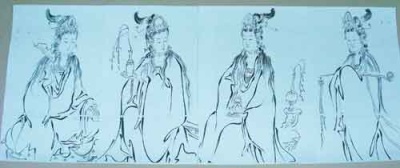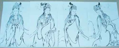 既然人家说喜欢,刘章崐答应就他试试。之后,他开始组稿、找参考资料。在拍卖书上他找到两张溥心畬画的菩萨,后来又找到一本文物出版社出的历代观世音百图。因为都是老画,他就挑线条简练的那种画,也没落款。当时,他自己感觉那些画画得很笨、很浊,线条也不流畅、不传神,自己很不满意。