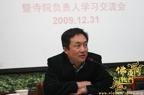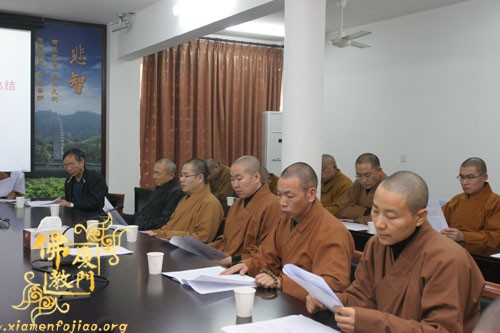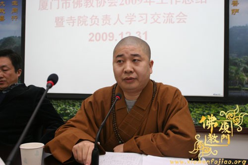 净心法师首先回顾了2009年的工作,对厦门寺院工作的具体情况做了汇报,提出了议题,讨论了寺院负责人员的学习交流情况。法云法师针对春节前的安全防火防盗工作要求各个寺院认真执行,确保安全平稳的度过新年。蔡永华副局长对厦门佛教界人士的表现给予了高度评价,并对今后的工作提出新的观点和要求,鼓励大家再接再励,齐心合力为厦门佛教事业努力。最后,则悟大和尚对今年的工作做了总结,不足之处做了指导,对今后的工作提出了希望和要求,最后祝愿大家新年快乐,会议在和谐的气氛中结束。
