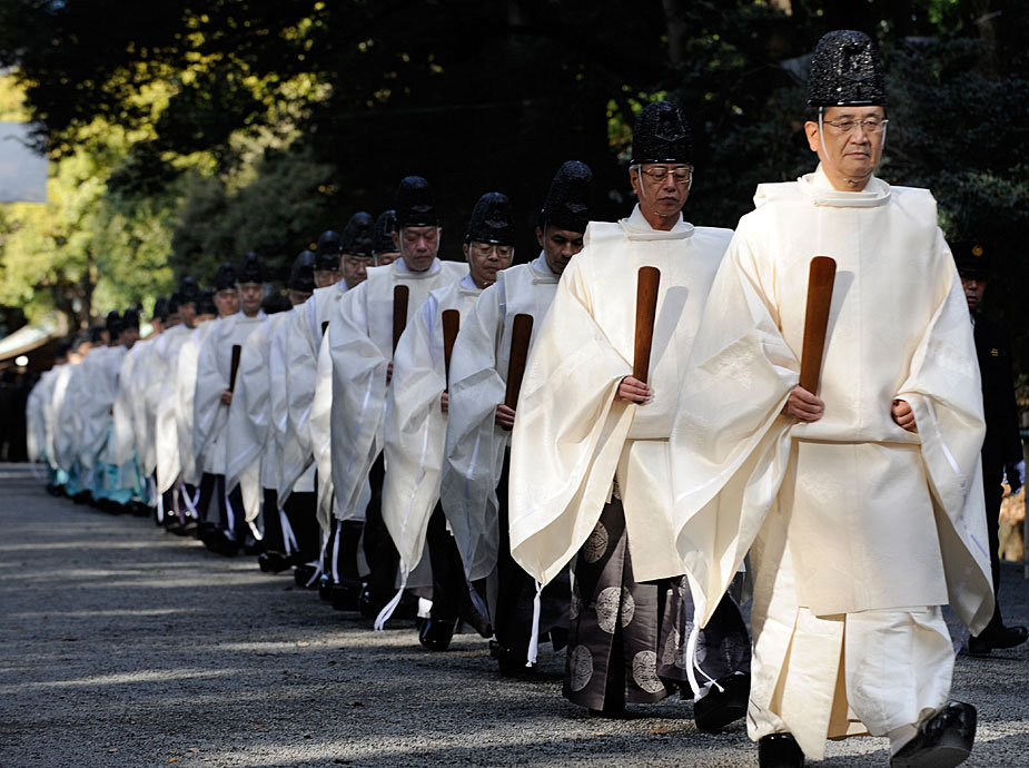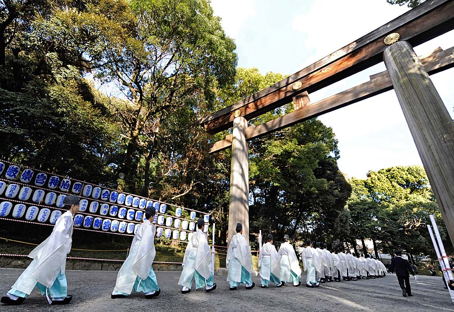 图为图为12月31日,日本东京僧人走在去祭祀的路上。每年日本都要在新年来临之际举行祈福仪式。