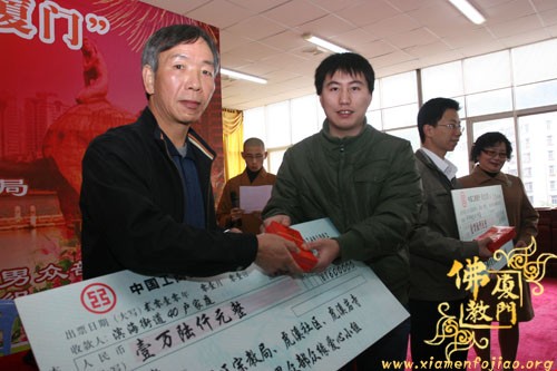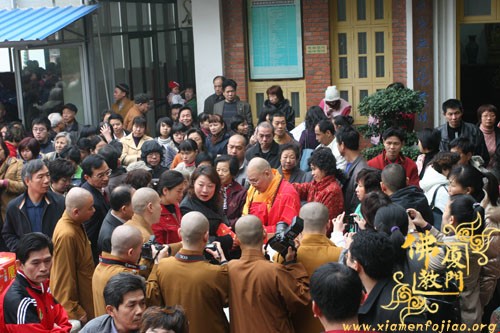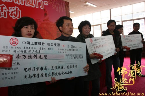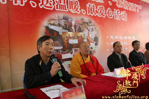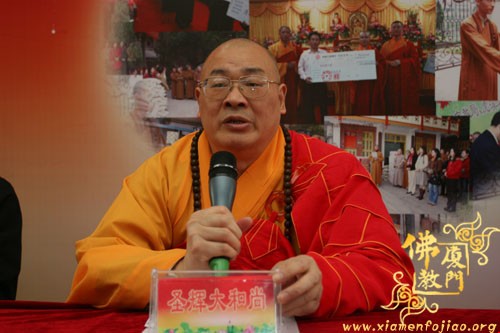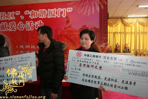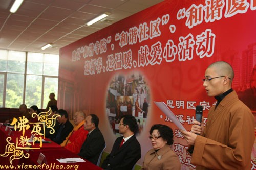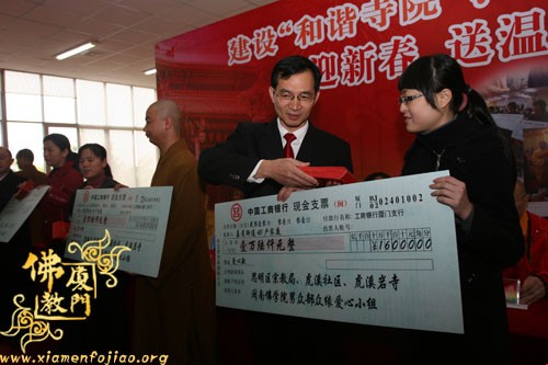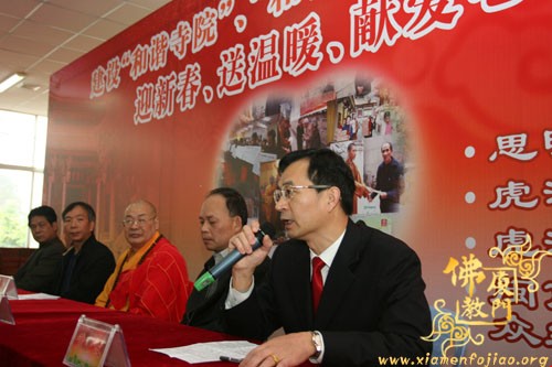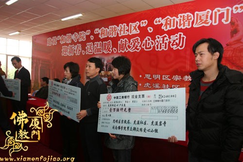 2010年元旦,在虎年来临之际,厦门思明区宗教局、虎溪社区、虎溪岩寺、闽南佛学院男众部众缘爱心小组联合举办的“建设和谐寺院、和谐社区、和谐厦门,迎新春、送温暖、献爱心”活动于上午9时30分在虎溪岩寺举行。全国人大代表、中国佛教协会副会长、湖南省佛教协会会长、闽南佛学院院长、虎溪岩寺方丈圣辉大和尚,厦门市民宗局曾文瑛局长,市民宗局一处黄镇辉处长,开元街道武装部杨石勋部长,思明区民宗局黄诚局长,虎溪社区陈晓梅书记,虎溪岩寺监院净心法师和闽院男众部众缘爱心小组成员、虎溪岩寺常住僧众以及社会各界人士、护法善信、各街道的爱心对象家庭参加了本次活动。