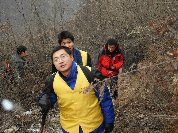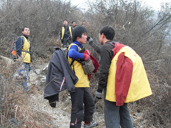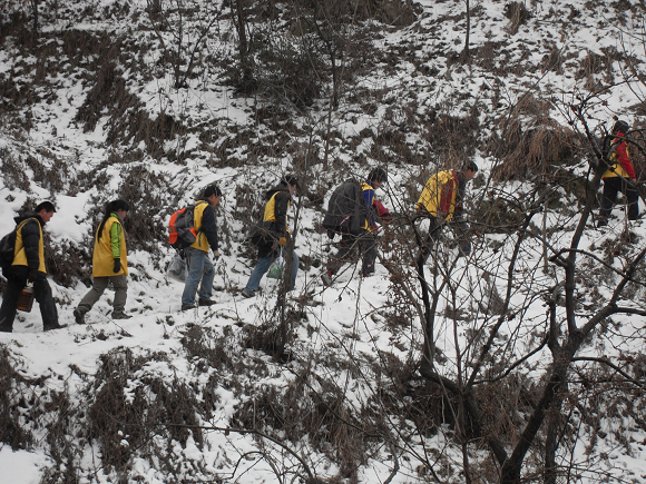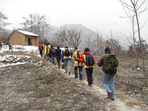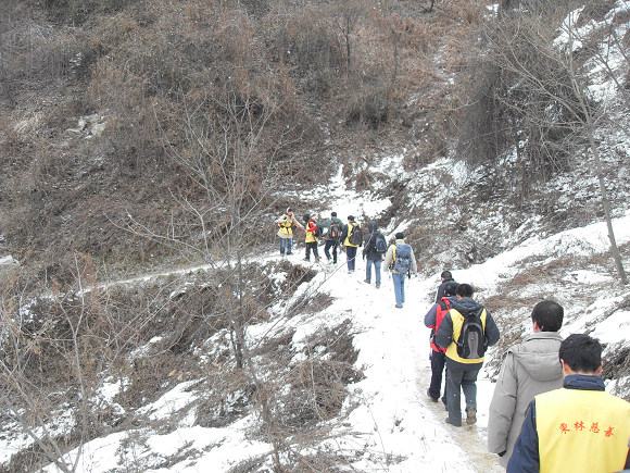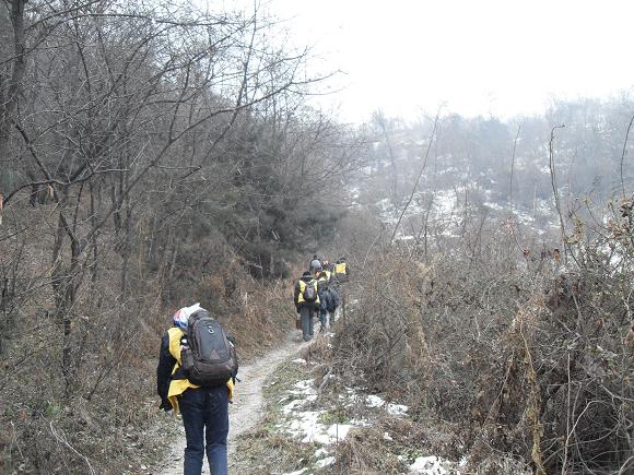 在山底时,空中零星飘着雪花,像天上降下的花朵,朵朵洒落在我们的衣服上,消失在树林丛中。仰脸望去,山顶跟我们相隔万里,山谷里飘起的雾霭攀沿到山顶。我们的队伍就像一条黄色的线条,湮没在弯曲的山路间。