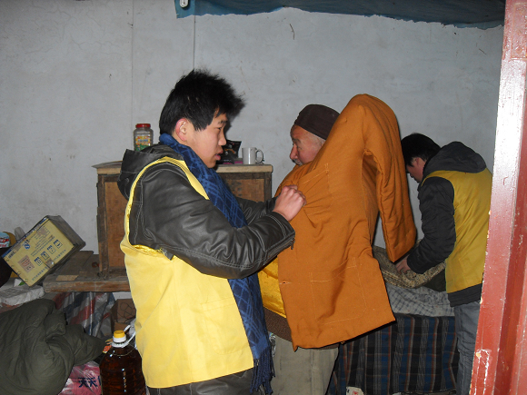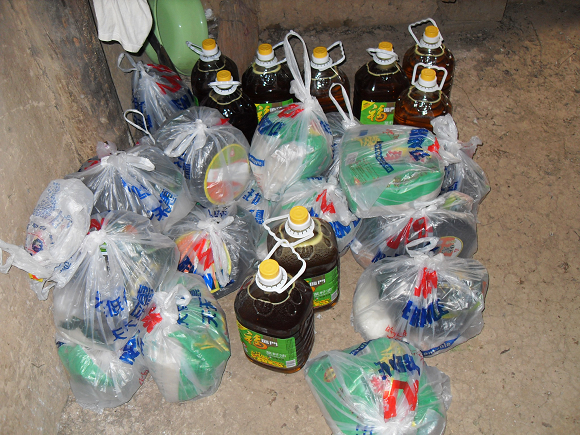 到东林慈善陕西联络处时,大伙正在分菜和米。天气虽然有些冷,但是大家安定的神情和干练的动作,让我为之一振。当下心里充满了惭愧,同样是大冷的天,他们来得真早,自己以为是早到的了,到了才知,更有早来人。
