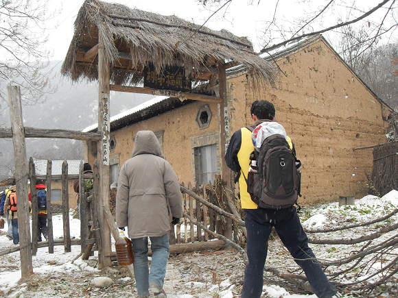 雪落了厚厚一层,稍作休息后,大家必须要离去。在出门时,看到蓬门顶上贴着发黄的两个字“佛心”。本想着住山修行是一种很艰辛的生活,看到他们脸上自然的笑容和悠闲的神情,才知道真正的享受是属于他们的,我们还在苦海里挣扎。