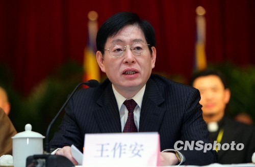 2月1日,中国佛教协会第八次全国代表会议在北京开幕。图为国家宗教事务局局长王作安在开幕式上讲话。 中新社发 刘震 摄