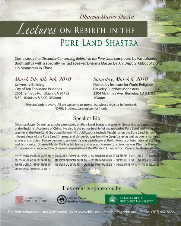 应联合国蒙特梭利教育总会、旧金山万佛圣城、硅谷闻思修居士林、新加坡居士林邀请,东林寺代住持上大下安法师将于2010年2月26日---3月16日前往美国、新加坡两地,进行为期20天的弘法交流活动。