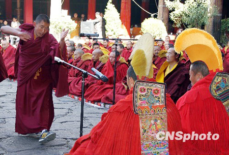 上午10时许,立宗答辩仪式正式开始。按照传统宗教惯例,首先举行了无斋佛事活动。在由22人组成的考评委员会的监考下,9名应考格西拉让巴学位的考僧轮流答辩众僧提出的有关因明、中观、般若、戒律、俱舍五部大论方面的问难。考场上时时能听见僧人诘问时“啪啪”作响的击掌之声。9名考僧分五组应答,最多时提问众僧达到8人以上,考场上或激烈交锋,或传出朗朗笑声,辩经声此起彼伏。