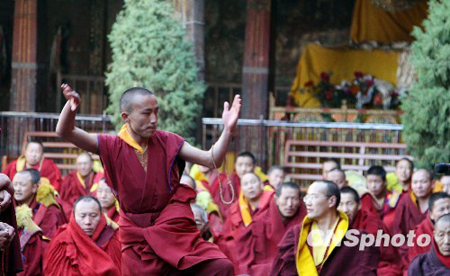 立宗答辩仪式结束时,按照传统宗教惯例,所有参加答辩仪式的僧人集体诵经祈祷释迦牟尼,色拉寺领经师嘎玛领诵经文。