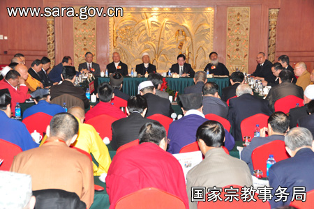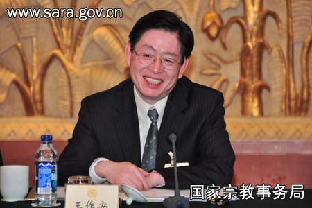 “多组织宗教工作部门、宗教界和学界就当前佛教界出现的新情况新问题进行广泛深入的调查研究”; “对道教界人才的培养力度亟待加强”; “要巩固2009朝觐成果,继续做好穆斯林群众参加有组织朝觐的引导工作”; “加强神学思想研究,探索适应中国国情和文化的神学理论来引导中国教会福传牧民的实践”; “推动各地基督教社会服务事工在更广泛层面发挥作用”; “尽快理顺宗教活动场所与景区管理的关系”; “把宗教界人士参加社保工作向纵深推进”; “要进一步细化政府依法管理,改进基层工作作风”; …… 3月8日下午,在友谊宾馆的“两会”驻地,出席全国“两会”的六十余名宗教界委员代表济济一堂,热议宗教工作重点难点,共商建设和谐宗教大计。国家宗教事务局局长王作安,副局长齐晓飞、蒋坚永,各业务部门主要负责人及全国政协民宗委相关负责人专程前往,认真听取宗教界委员对宗教工作的意见和建议。 当天,会议由全国政协常委、中国伊斯兰教协会会长陈广元大阿訇主持,全国政协常委、中国佛教协会副会长刀述仁,全国政协委员、中国道教协会副会长唐诚青,全国政协委员、中国伊斯兰教协会副会长兼秘书长洪长有,全国政协委员、中国天主教爱国会副主席詹思禄,全国政协委员、中国基督教协会新任总干事阚保平等代表各教作重点发言,他们分别就宗教界人才培养、宗教教职人员参加社保、宗教活动场所与景区管理、宗教工作经费保障等备受关注的问题,提出诸多富有前瞻性与可操作性的意见和建议。 在听取了五大宗教的全国政协委员就我国各宗教的情况发言和提出的有关意见、建议后,局党组书记、局长王作安首先代表我局感谢宗教界委员对宗教工作的关心和支持。他谈到,3月4日,全国政协会小组讨论一开始,中共中央政治局常委、中央政法委书记周永康同志就来到宗教界别组,和宗教界委员共商国是。在讨论中,宗教界的政协委员就宗教工作提出了很好的意见和建议。在今天的讨论中,大家又进一步阐明了观点和想法。在接下来关于2010年宗教工作的思路和要点的通报中,将对委员们关心的问题一一进行答复。 王作安表示,2010年,国家宗教局围绕“全面贯彻党的宗教工作基本方针,深入落实宗教事务条例,牢固树立宗教和谐理念,夯实基础与攻克重点难点双管齐下,依法管理与积极引导齐头并进,开拓创新,求真务实,努力做好新形势下的宗教工作”的总体思路,重点推进“深入落实宗教事务条例,做好涉藏涉疆宗教工作,完成全国性宗教团体换届,倡导和谐理念、推进神学思想建设,推动解决宗教领域重点难点问题,支持做好上海世博会、广东亚运会的宗教服务工作,努力为宗教界办实办好如宗教界人士参加社保、拓宽宗教界参与公益事业渠道之类的事,推进同港澳台宗教界的联系,进一步加强对外交流”等九方面工作。 此外,王作安还就委员们关注的“深化依法管理宗教事务,加大宗教界人才培养力度,发挥宗教人士和宗教信众的积极作用,尽快理顺宗教活动场所与景区管理关系,进一步推动落实宗教界房产”等问题作了进一步阐述。最后,王作安特别强调,各位委员提出的宝贵意见建议,局党组和局务会议要专题研究、充分吸取,在今后的工作中积极落实,并希望以后能多开展对话形式的交流,共同为做好宗教工作献计献策。