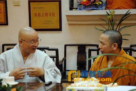 2010年3月1日下午,在韩国东国大学佛学院院长、曹溪宗考试委员长法山长老带领下,韩国“六祖惠能大师圣地巡礼”参观团一行21人,到广东省光孝寺进行参访。广东省佛协办公室副主任、光孝寺西堂法成法师,知客悟定法师热情接待了参观团一行。