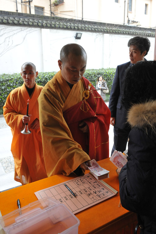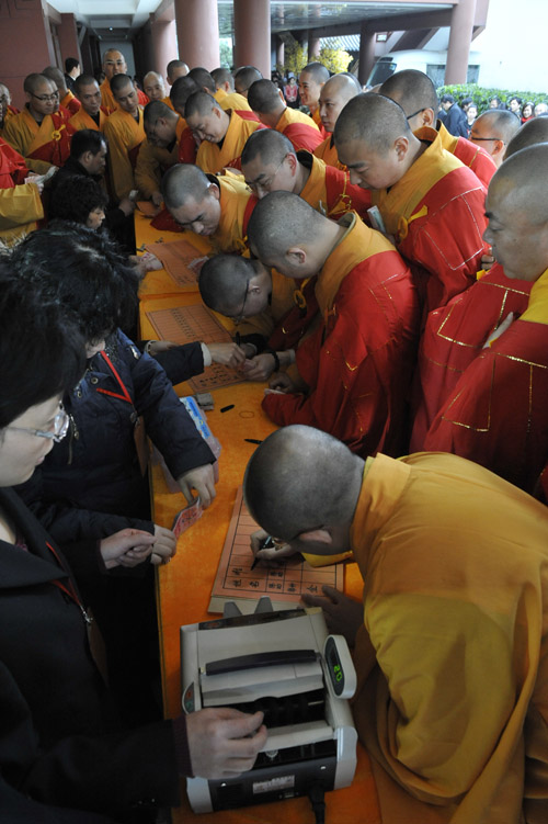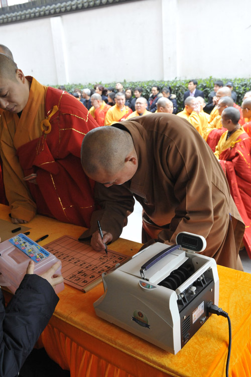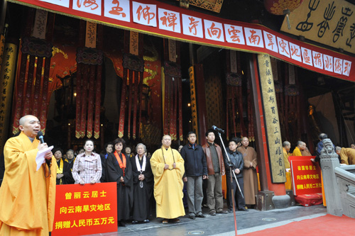 捐赠仪式上,觉醒大和尚代表寺院向云南旱灾地区捐赠五十万人民币用于购买饮用水,云南省政府驻沪办办公室主任张进先生代表灾区接受了捐赠,并对玉佛寺的善举表示衷心感谢。前来参加活动的“玉佛禅寺觉群慈爱功德会”名誉理事长曾丽云居士、副理事长马玉红居士、徐国珍居士、薛宝中居士、金爱玉居士、乔丽华居士、云龙子居士等也分别捐出5万至2万元不等的现金,把现场的捐赠活动引向高潮。玉佛寺的全体僧职员工,也自觉排队在写缘薄上记下自己捐赠的善款,直接向灾区人民献出自己的爱心。