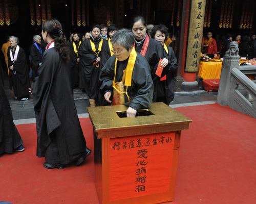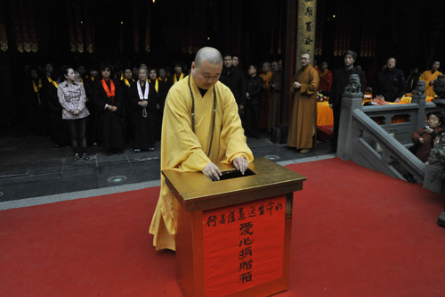 慈善与文化一直就是玉佛禅寺寻求的与当代社会相适应、相融合的主要内容,也是玉佛寺作为都市佛教代表践行人间佛教的主要内容。前来参加捐赠活动的市、区政府领导对玉佛寺近年来开展的慈善和文化活动也给予了积极的支持,充分肯定了玉佛寺长久以来一直禀持的佛教慈悲理念,行菩萨道,救危助困,扶弱济贫,在历次抗险救灾中,都能率先表现,带领上海佛教界向灾区人民捐赠钱物、送去温暖。并且已经形成了寺院的传统和特色,无论是早年的印度洋海啸、98年的大洪灾,还是2008年初的大雪以及“五·一二”惨烈的地震,都能看到玉佛寺的僧职员工聚集起来,出钱出力,全力救助灾区人民,帮助他们克服困难、恢复生产与生活,渡过难关。今天在寺内为旱灾地区举行的捐水活动,是玉佛寺大行菩萨道向社会奉献的又一份爱心,我们相信,集这一份份的爱心,不仅能为灾区人民送去佛门弟子关爱,同时也能呼吁并带动更多的人加入到为灾区奉献爱心的行列。