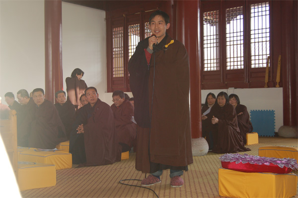 众位佛弟子的发言结束后,大家热烈鼓掌欢迎总监香师定圆法师做总结性开示。