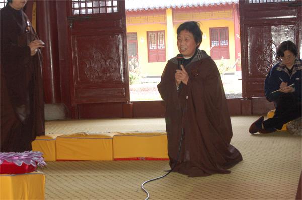 首先在交流会上发言的,是两位比丘尼师父。第一位尼师体弱多病,出家后曾经三次闭关念佛,这次闭关24天。在关中,她用《金刚经》的“过去心不可得,现在心不可得,未来心不可得”来观照念佛中出现的躁妄情绪,精进念佛。15天后业障现前,身体疼痛难忍,但她没有退缩,甚至在下雪天撤掉床上的电热毯,抱着寿尽即随佛往生的信愿念佛,半个多小时后,疼痛竟奇迹般消失。尼师激动地说,此次闭关,感觉因果真实不虚,念佛时,总感觉有只黄狗的影子浮现在脑海,尼师不知因何,后来恍然记起,自己14岁那年,伙同玩伴曾经打死了一条大黄狗,这是冤亲债主来了。尼师赶紧忏悔罪业,将念佛功德回向给它,不久黄狗便无影无踪了。尼师感慨地说,一句佛号,真能消业,回去后坚持每天念两万声佛号,并致力于弘扬净土法门,希望大家都来东林寺闭关念佛。