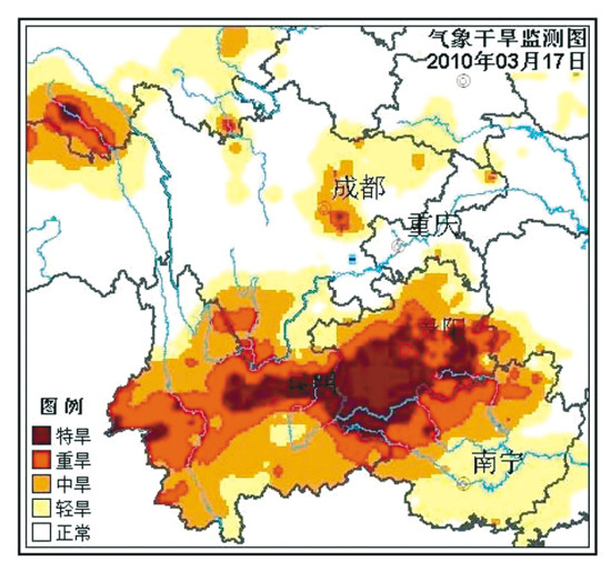 日前,中国西南5省市区正在遭受历史罕见的大旱。云南、广西部分地区的旱情已达到特大干旱的程度,贵州省秋冬连旱,出现80年一遇,甚至百年一遇的旱情。