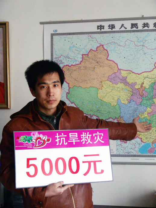 “感恩的心”最小的志愿者,捐出自己攒下来的100元压岁钱,。支援灾区小朋友有水喝!