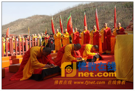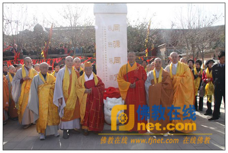 韩国圆融院(宗)僧众、无碍禅寺僧众在大雄广场处举办祈福法会。随后,果建法师与一空长老一起为同源同宗纪念碑揭幕。